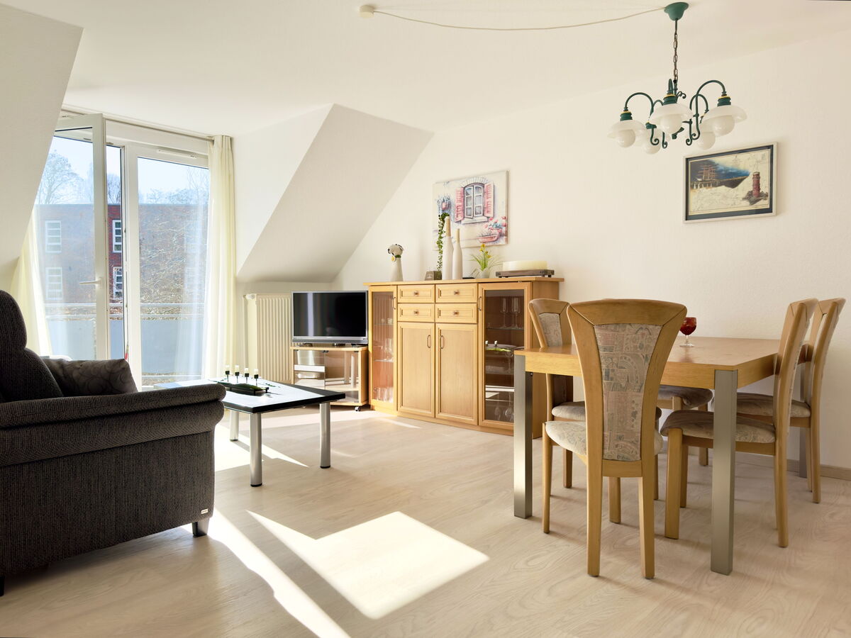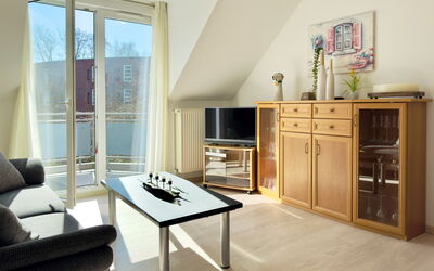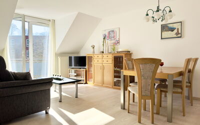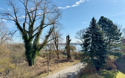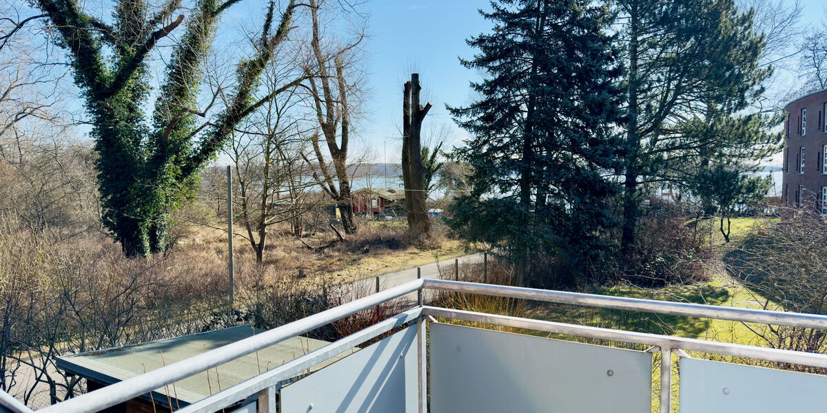 Das L-förmig geschnittene Wohnzimmer mit angrenzendem Essbereich überzeugt durch Helligkeit und eine angenehme Aufteilung. Von hier gelangen Sie auf den sonnigen Südost-Balkon mit traumhaftem Blick ins Landschaftsschutzgebiet der Pötenitzer Wiek – ein idealer Rückzugsort, um Ruhe und Natur zu genießen.