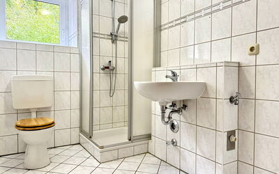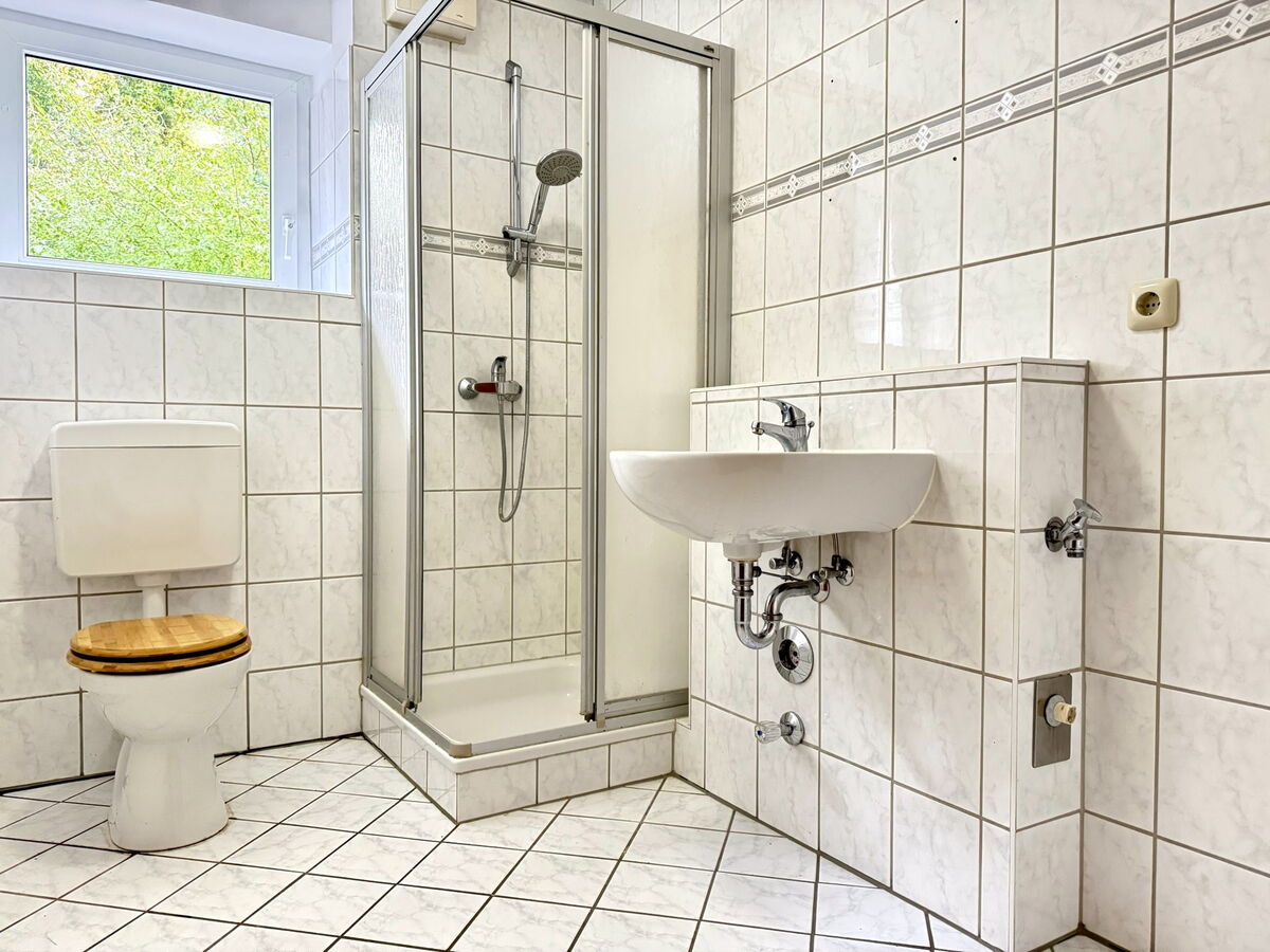 • Großzügiges, hell gefliestes Bad mit Dusche, Fenster für Tageslicht und Belüftung sowie Waschmaschinenanschluß