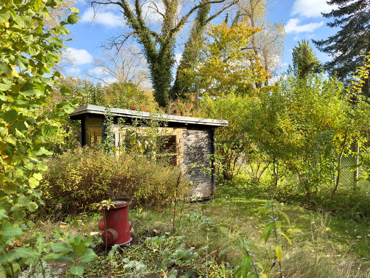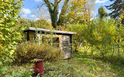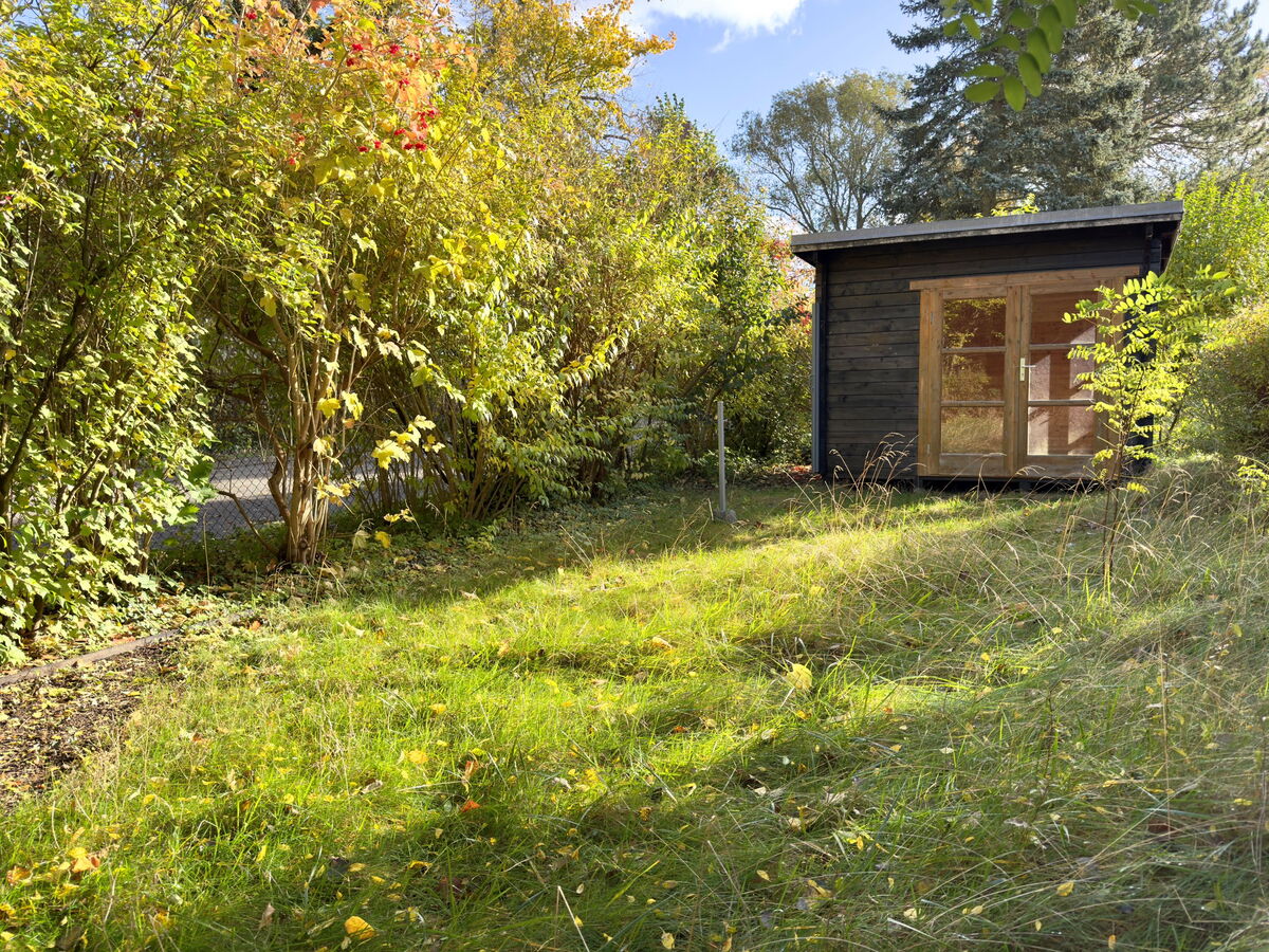Das Herzstück der Wohnung ist das helle, L-förmig geschnittene Wohnzimmer mit Zugang zur teilweise überdachten Terrasse und dem weitläufigen Garten. Der Garten zeigt sich derzeit in einem naturbelassenen, leicht verwilderten Zustand und bietet damit die perfekte Grundlage, um eine persönliche Wohlfühloase zu gestalten – ob blühender Ziergarten, gemütliche Sitzecke oder Gemüsebeet: Hier ist Raum für kreative Ideen und grüne Träume. Ein charmantes Gartenhaus mit ca. 12 m² bietet zusätzlichen Platz für Geräte und Gartenmöbel.