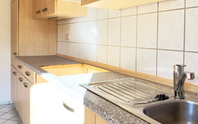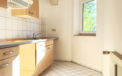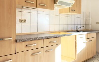 Die moderne, helle Einbauküche schließt direkt an den Wohnbereich an und bietet Platz für einen kleinen Essbereich. Die Einbauküche ist ohne Elektrogeräte ausgestattet, sodass der neue Eigentümer diese ganz nach eigenen Vorstellungen ergänzen kann.